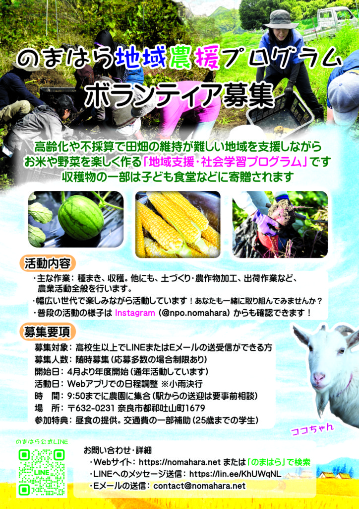 2026年度の地域農援プログラムのボランティアさん募集です。